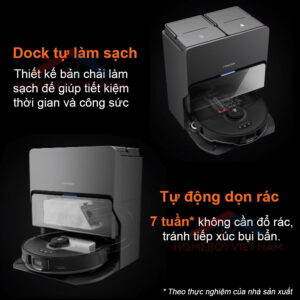 Dock sạc với ngăn chứa rác dung tích lớn, sẽ hút toàn bộ bụi bẩn từ hộp bụi trên robot sau mỗi lần dọn dẹp. Người dùng có thể yên tâm sử dụng mà không cần phải lo lắng về vấn đề đổ rác trong thời gian lên tới 7 tuần. Qua đó mang tới trải nghiệm thuận tiện và tiết kiệm thời gian cho người dùng.