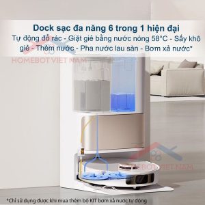 - Bình nước sạch và nước bẩn cùng dung tích 4.5L. Khi giẻ lau dơ hoặc hoàn thành việc làm sạch, nó sẽ quay lại trạm sạc để giặt giẻ bằng nước nóng 58°C, loại bỏ hoàn toàn các vết bẩn còn sót lại trên giẻ lau. Sau đó, phần khăn lau cũng sẽ được sấy khô bằng khí nóng để ngăn ngừng sự hình thành nấm mốc và mùi khó chịu.