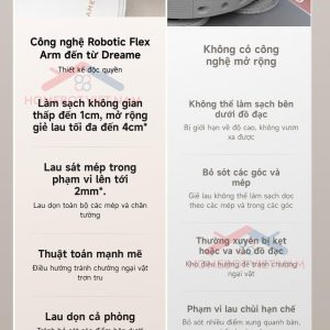 Với thuật toán điều hướng mạnh mẽ, Robot Dreame L30s Ultra có thể di chuyển mượt mà qua các chướng ngại vật, đảm bảo làm sạch toàn diện mọi ngóc ngách trong phòng. Ngay cả dưới các đồ nội thất thấp, robot vẫn hoạt động hiệu quả mà không bỏ sót bất kỳ khu vực nào. Thêm vào đó, với khả năng mở rộng miếng đệm lau nhà hơn 1 triệu lần trong các thử nghiệm độ bền, sản phẩm này không chỉ mạnh mẽ mà còn bền bỉ, trở thành giải pháp làm sạch lý tưởng cho mọi gia đình.