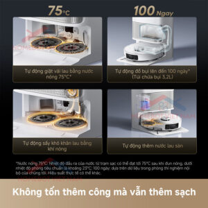 - Đổ bụi tự động: Với túi chứa dung tích lớn 3.2L, robot có thể hoạt động liên tục trong 100 ngày mà không cần thay túi chứa bụi.