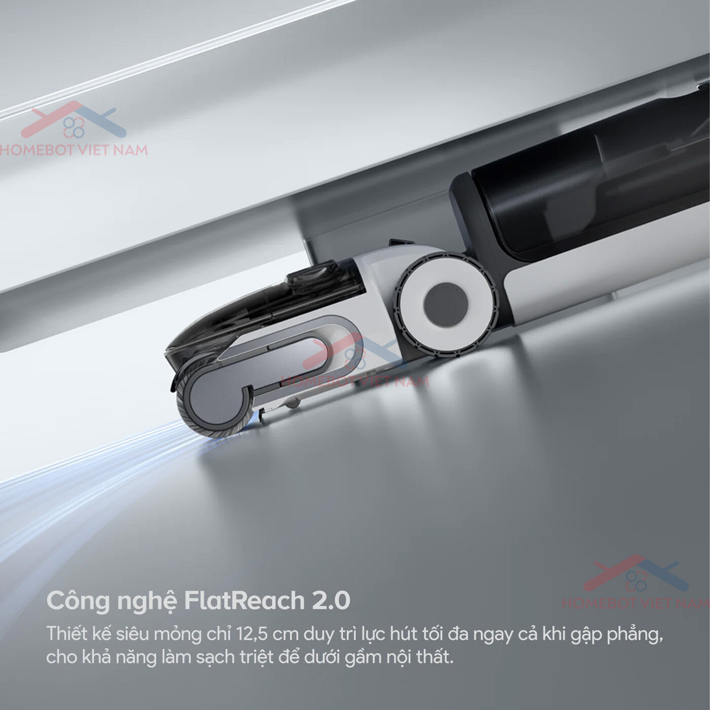 Sở hữu thiết kế FlatReach 2.0, Roborock F25 Gen 2 có thể ngả phẳng hoàn toàn 180° với độ dày thân máy chỉ 12,5 cm. Ngay cả khi ở trạng thái nằm sát sàn, lực hút vẫn được duy trì ổn định, giúp thiết bị dễ dàng tiếp cận và làm sạch sâu các khu vực khó như gầm giường, gầm tủ. Đây là giải pháp lý tưởng để loại bỏ bụi bẩn ở những vị trí mà các thiết bị thông thường khó chạm tới.