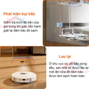 - Trong quá trình giặt giẻ, tính năng phát hiện sẽ kiểm tra mức độ bẩn của giẻ lau để quyết định xem chúng có cần được giặt lại để đảm bảo độ sạch thích hợp hay không. Xác định khu vực có bụi bẩn, vết bẩn cứng đầu, robot sẽ tiến hành lau lại một lần nữa để đảm bảo sàn nhà được làm sạch hoàn toàn.