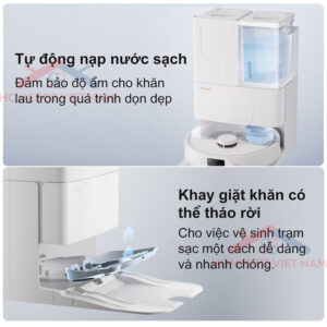 - Khay giặt khăn lau có thể tháo rời, giúp người dùng có thể vệ sinh trạm sạc một cách dễ dàng và nhanh chóng.