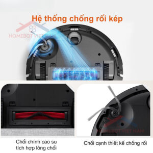 - Hệ thống chổi kép chống rối: Giảm tình trạng tắc nghẽn, tối ưu khả năng làm sạch trên thảm và sàn cứng.