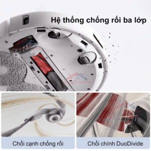 Chổi DuoDivide thiết kế kép với hai con lăn song song và lưỡi dao xoắn ốc giúp gom tóc và rác vào đúng tâm hút. Nhờ cơ chế này, robot tránh được tình trạng tắc nghẽn, đảm bảo duy trì hiệu suất làm việc ổn định trong suốt chu kỳ vệ sinh.