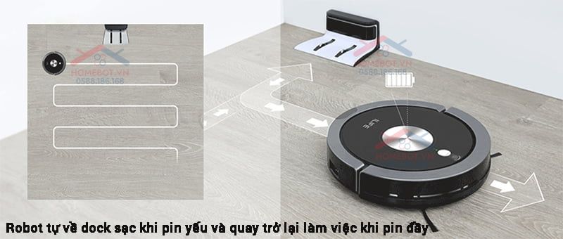 pin yếu. Kể từ khi sạc đủ dung lượng pin, robot sẽ tự động trở lại không ngừng làm công tác đang dở dang. Đây chính là